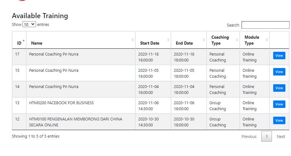 Ahli boleh login ke sistem untuk booking slot. Menu “Training: -> Available Training